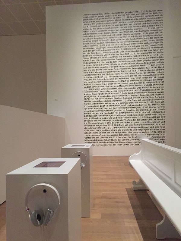 In der Ausstellung „Der Fall der Sterne“ werden drei künstlerische Vorstellungen vom Weltende und einer Zeit danach gezeigt. Sie verbinden sich zu einem Spannungsfeld zwischen Schöpfung, Zerstörung und Neuanfang. Um den Besucherinnen und Besuchern einen sinnlichen und emotionalen Zugang zu den Themen „Schöpfung“ und „Offenbarung“ zu ermöglichen, gibt es Medienstationen mit Musikstücken zu diesen Themen.