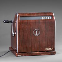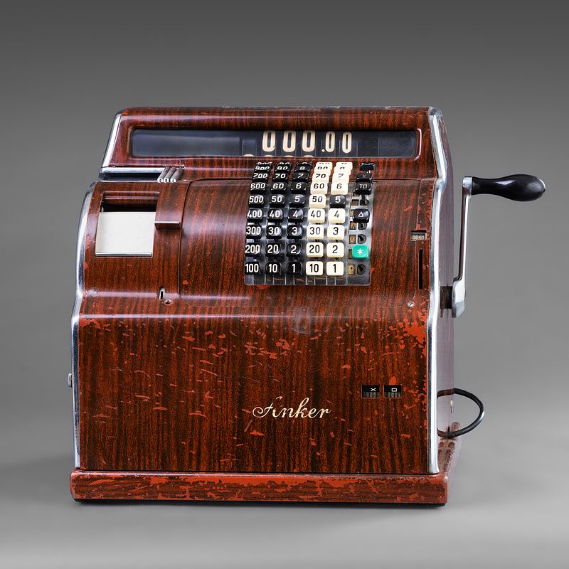 Prior to the introduction of electronic data processing, simple mechanical cash registers were still the norm right up to the 1960s. This 1950s cash register, made by Anker-Werke AG in Bielefeld, stood on the cash desk to the left of the cashier, followed in the middle by a cutting device for detaching sections of the label and, on the right, the drawer containing the small change. One section of the label was given to the customer as a receipt, while the remainder enabled the predominantly female workforce to compile tally sheets of what goods were actually being sold.